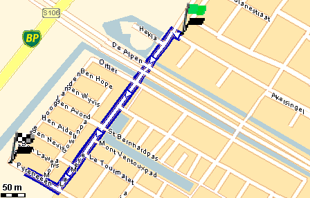 - Brug over, en bij de BP en de verkeerslichten rechts (S107 / de Alpen)